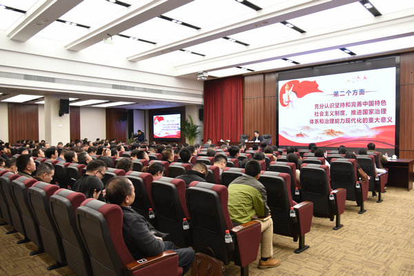 郑向东根据中央有关精神,结合自己的学习与思考,重点宣讲了五个方面的内容:一是党的十九届四中全会取得重要成果,影响十分深远;二是充分认识坚持和完善中国特色社会主义制度、推进国家治理体系和治理能力现代化的重大意义;三是深刻领会中国特色社会主义制度和国家治理体系的显著优势,坚定中国特色社会主义制度自信;四是关于《决定》提出的总体要求、总体目标和重点任务;五是贯彻落实全会精神的要求。