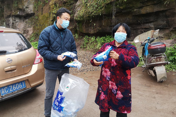 2020年3月4日,710公海寰宇投资公司派驻潼南区上和镇冬冲社区的第一书记唐剑锋(左一)给丁六珍送去种子和化肥。